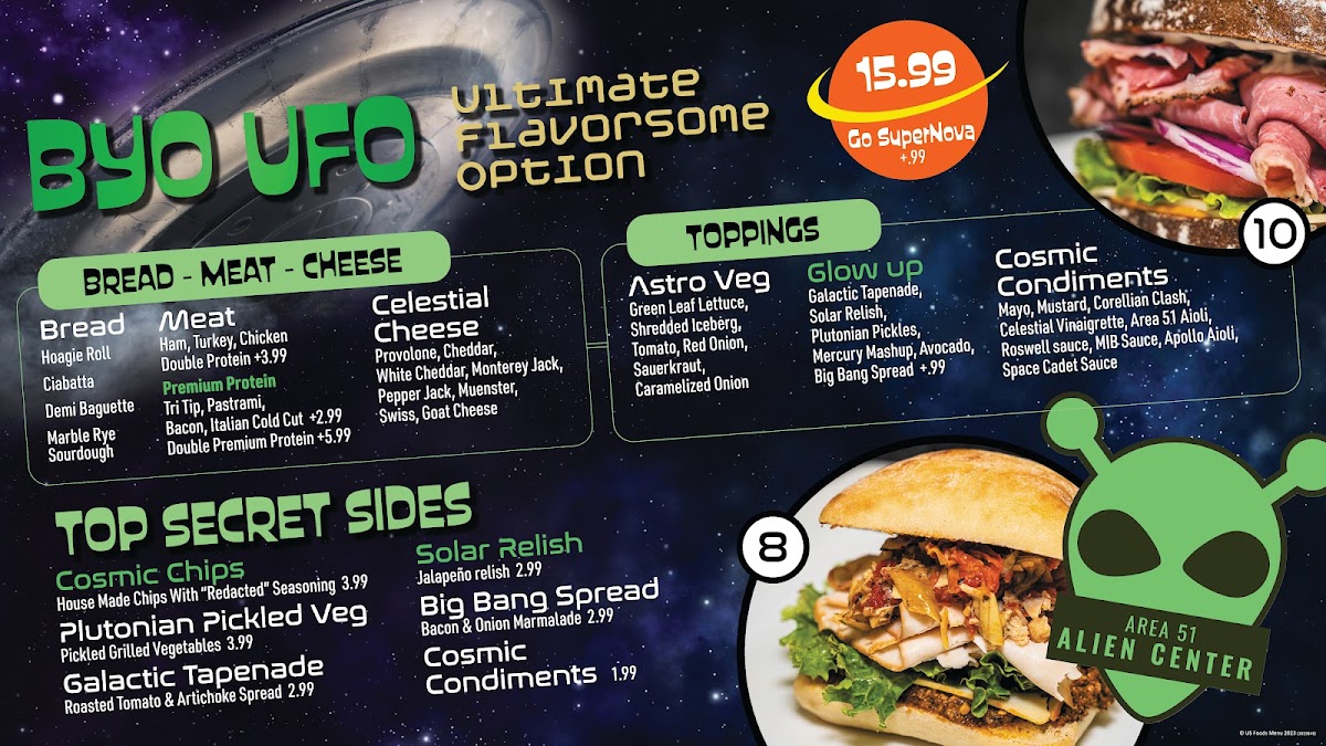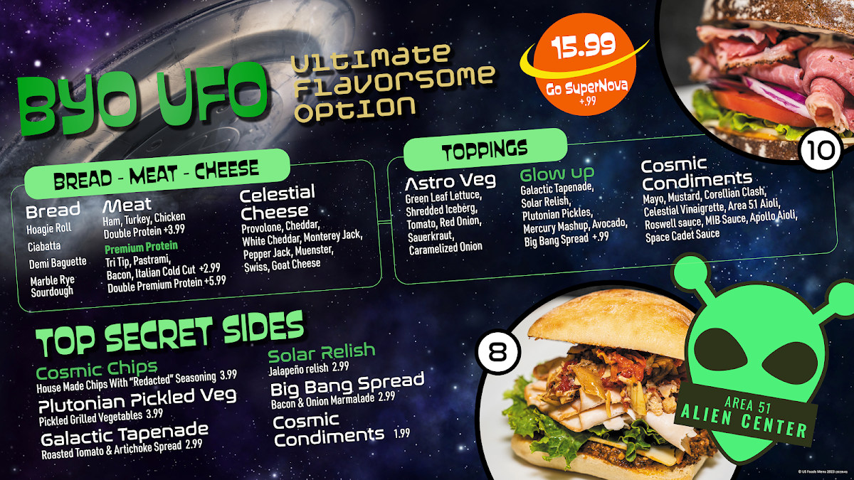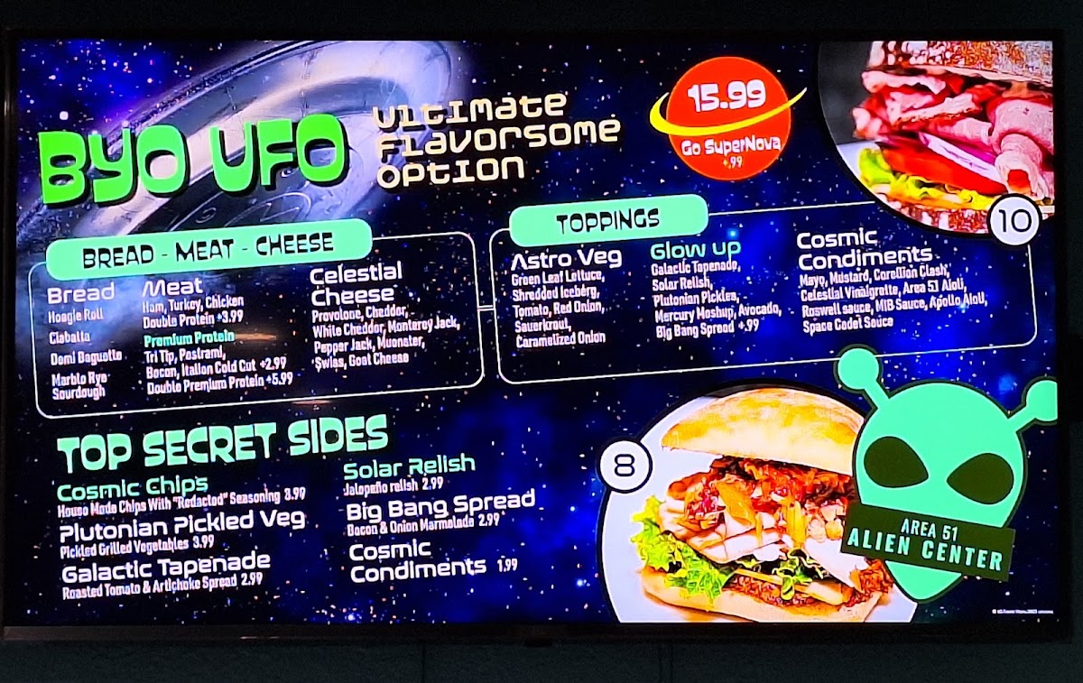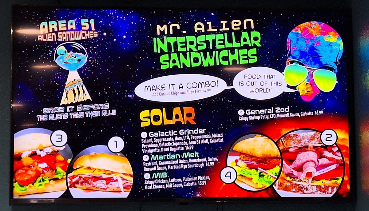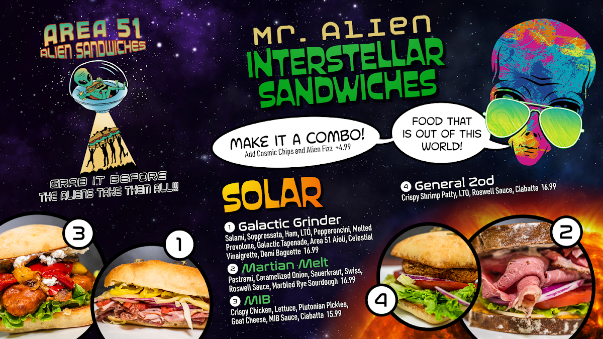 When you're in the mood for something delicious and different, Mr. Alien Sandwiches And Frozen Yogurt Menu has you covered. Located at 5388 US-95 in Amargosa Valley, NV, this quirky spot offers an exciting variety of sandwiches and frozen yogurt options that will make your taste buds do a happy dance. Whether you're craving a hearty sandwich with all the right toppings or a creamy frozen yogurt treat to cool off, there’s something on the menu for everyone. Each item is crafted to satisfy your cravings, from the classic to the more adventurous. The sandwiches are piled high with fresh ingredients, and the frozen yogurt comes in a range of flavors, perfect for customizing with toppings that are just as fun as they are tasty. Whether you're stopping by for a quick bite or a sweet treat, Mr. Alien Sandwiches And Frozen Yogurt promises a great experience every time.
